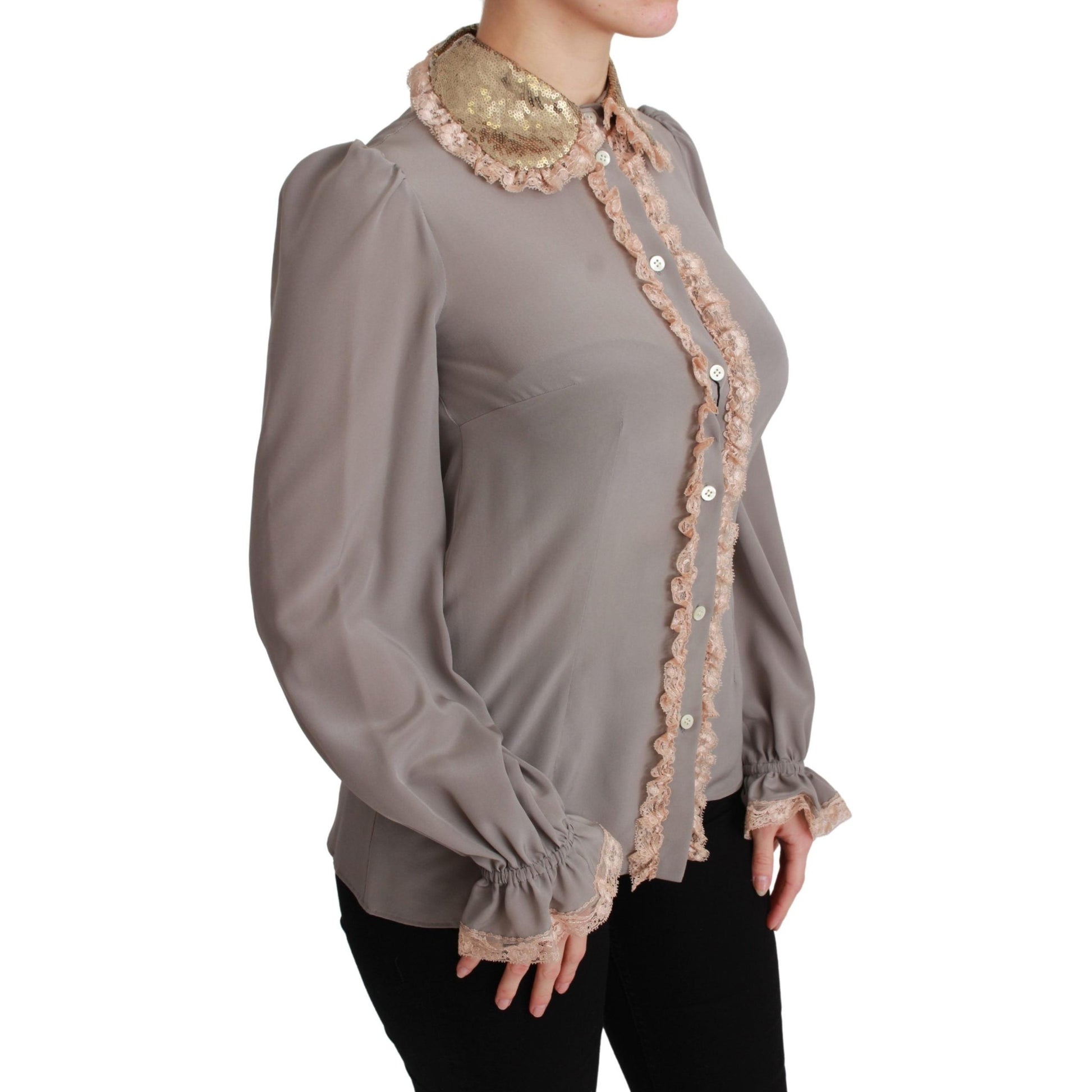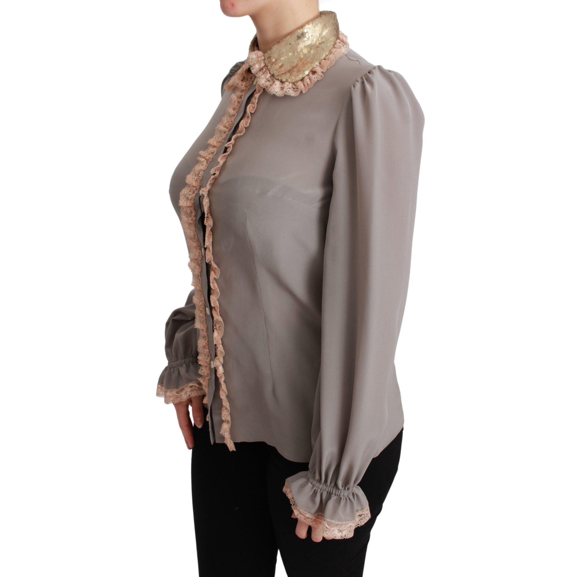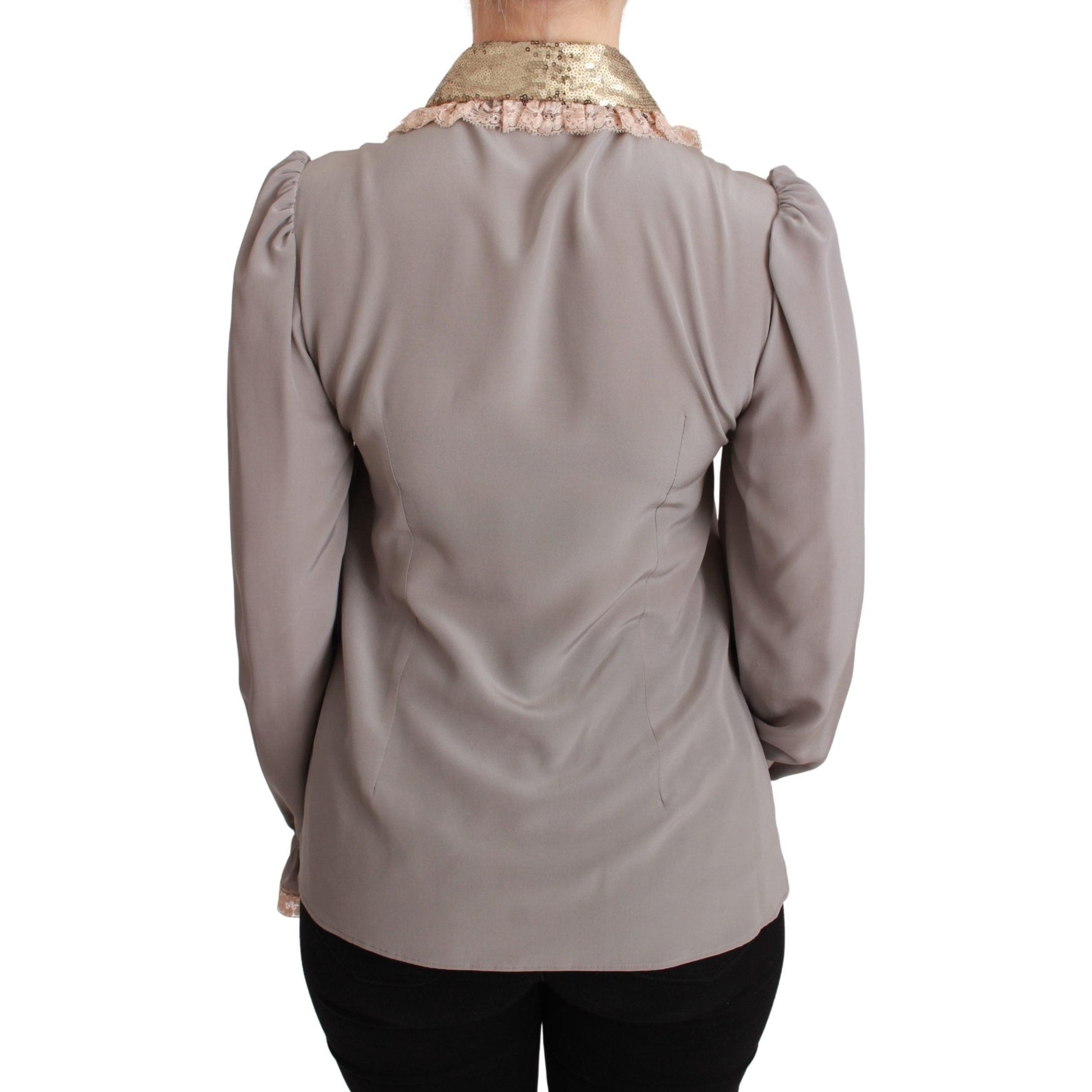 Gray Silk Gold Sequin Lace Blouse Shirt