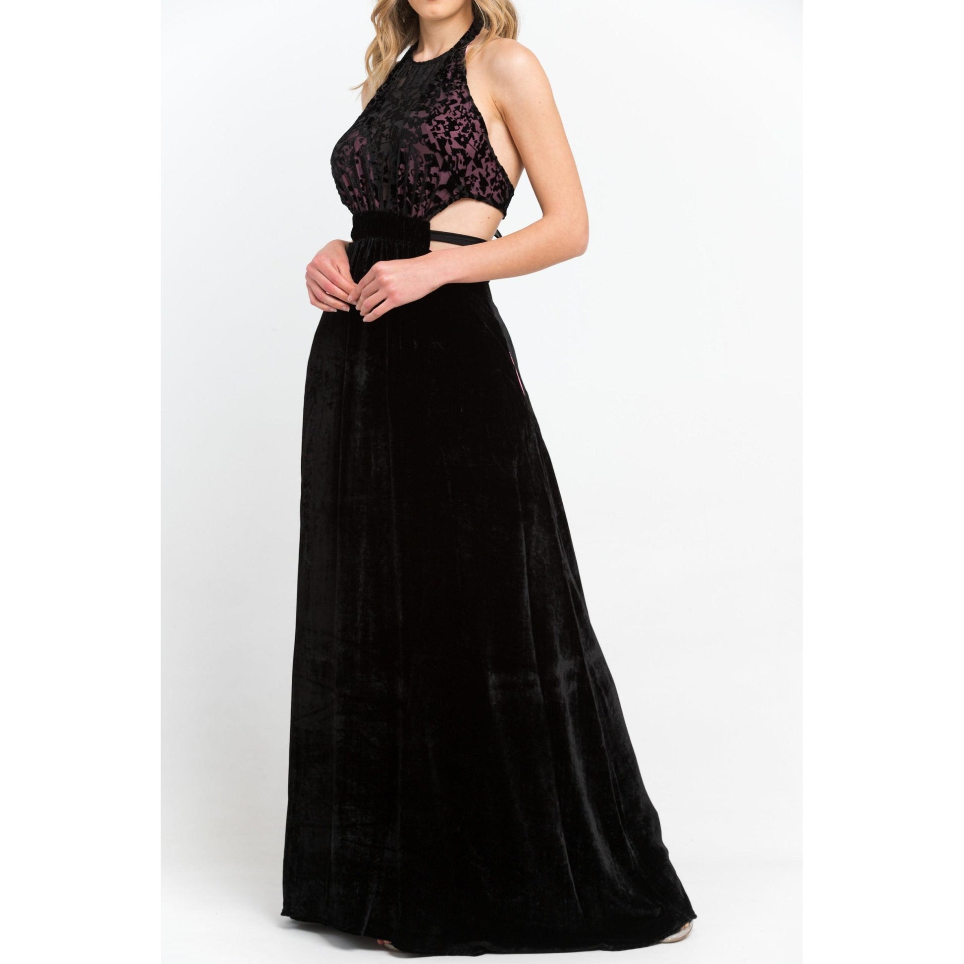 Long Dress With Velvet Skirt With Welt Pockets. Embroidery In The Velvet Bodice. Back Uncovered And With Lace Closure.