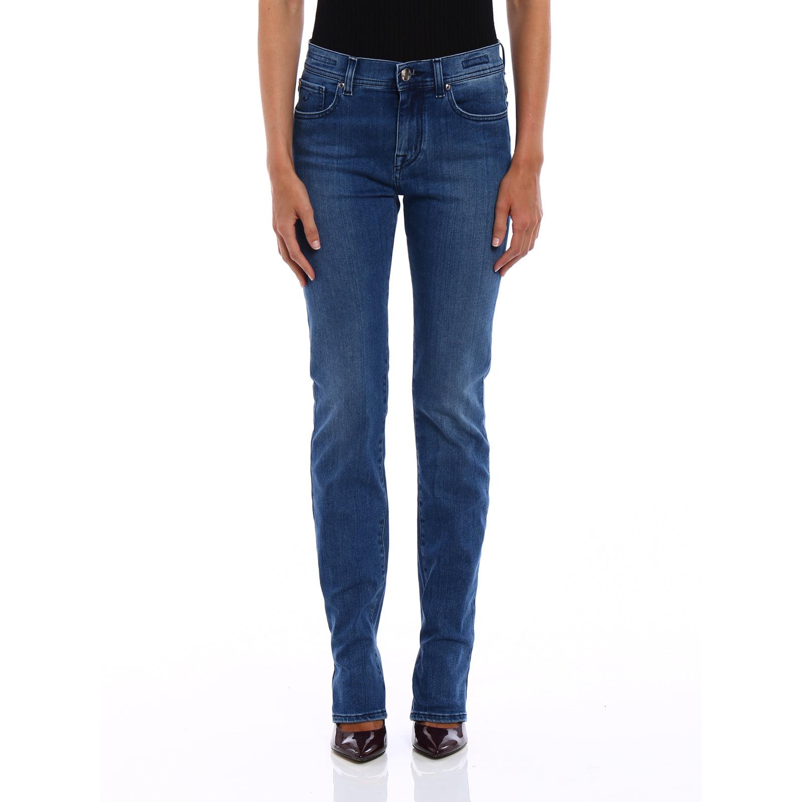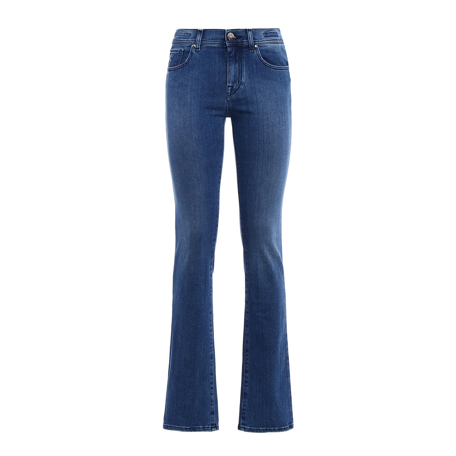 Jacob Cohen Jackie stretch five-pocket denim with medium waist and straight leg, metallic leather patch, Made in Italy