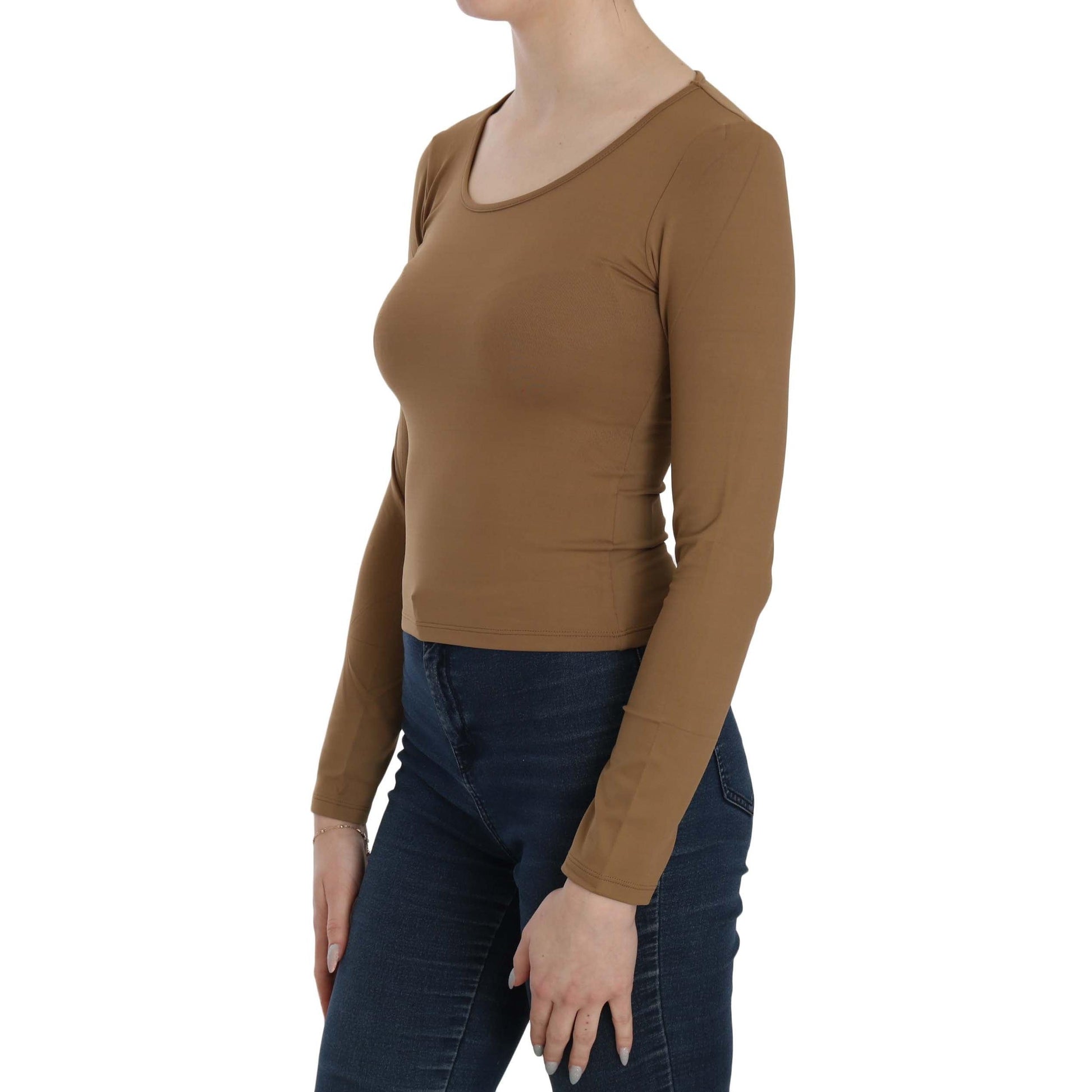 Brown Long Round Neck Sleeve Fitted Shirt Tops Blouse