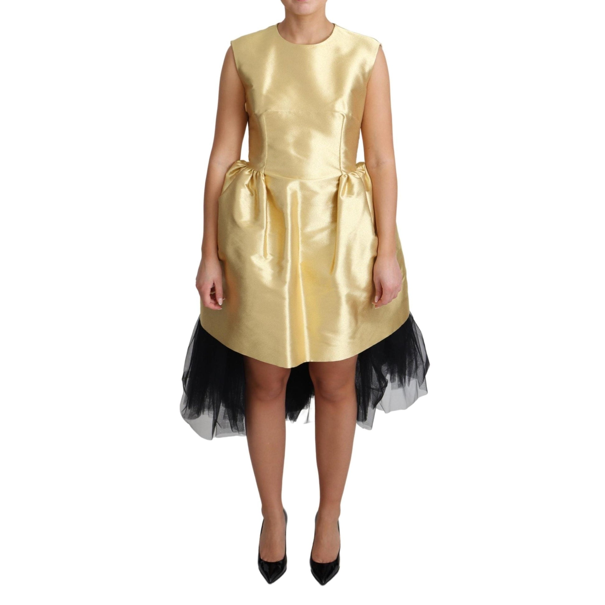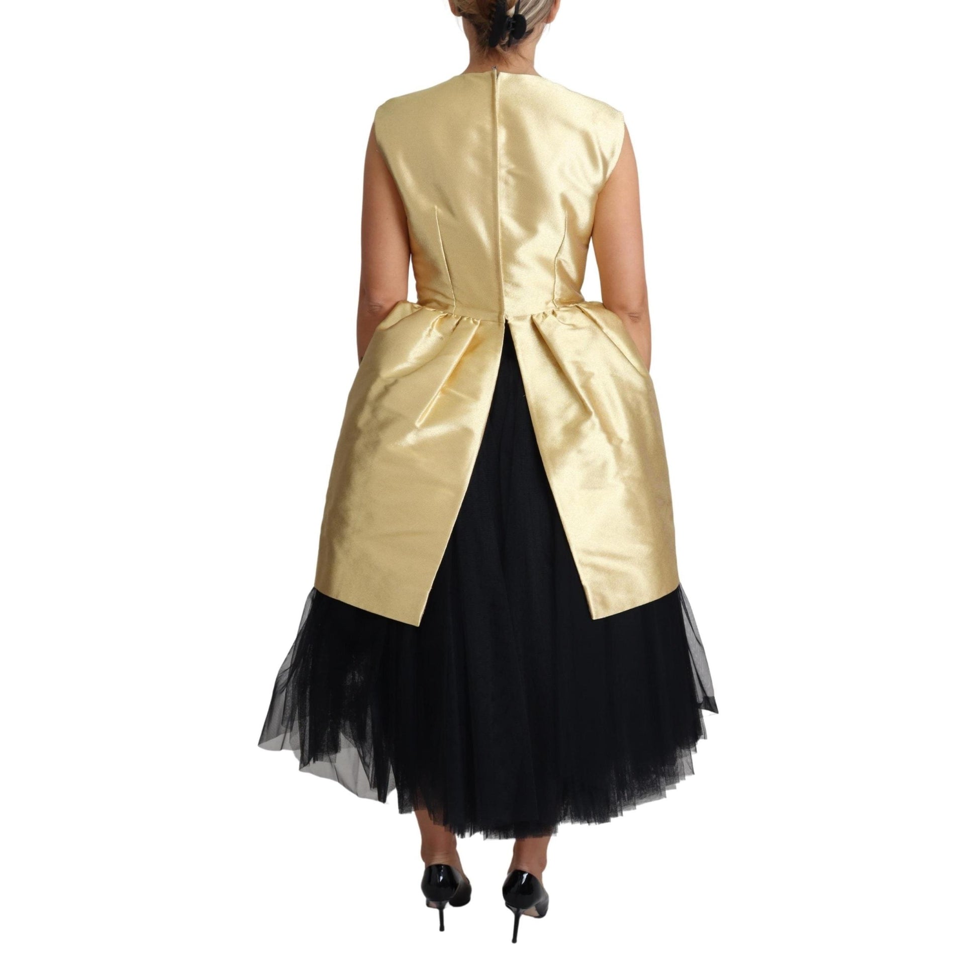 Gorgeous brand new with tags, 100% Authentic Dolce & Gabbana gold dress with black tulle, the craftsmen used to create a fitted dress with a round neckline and a flared, as if hastily sewn hem.