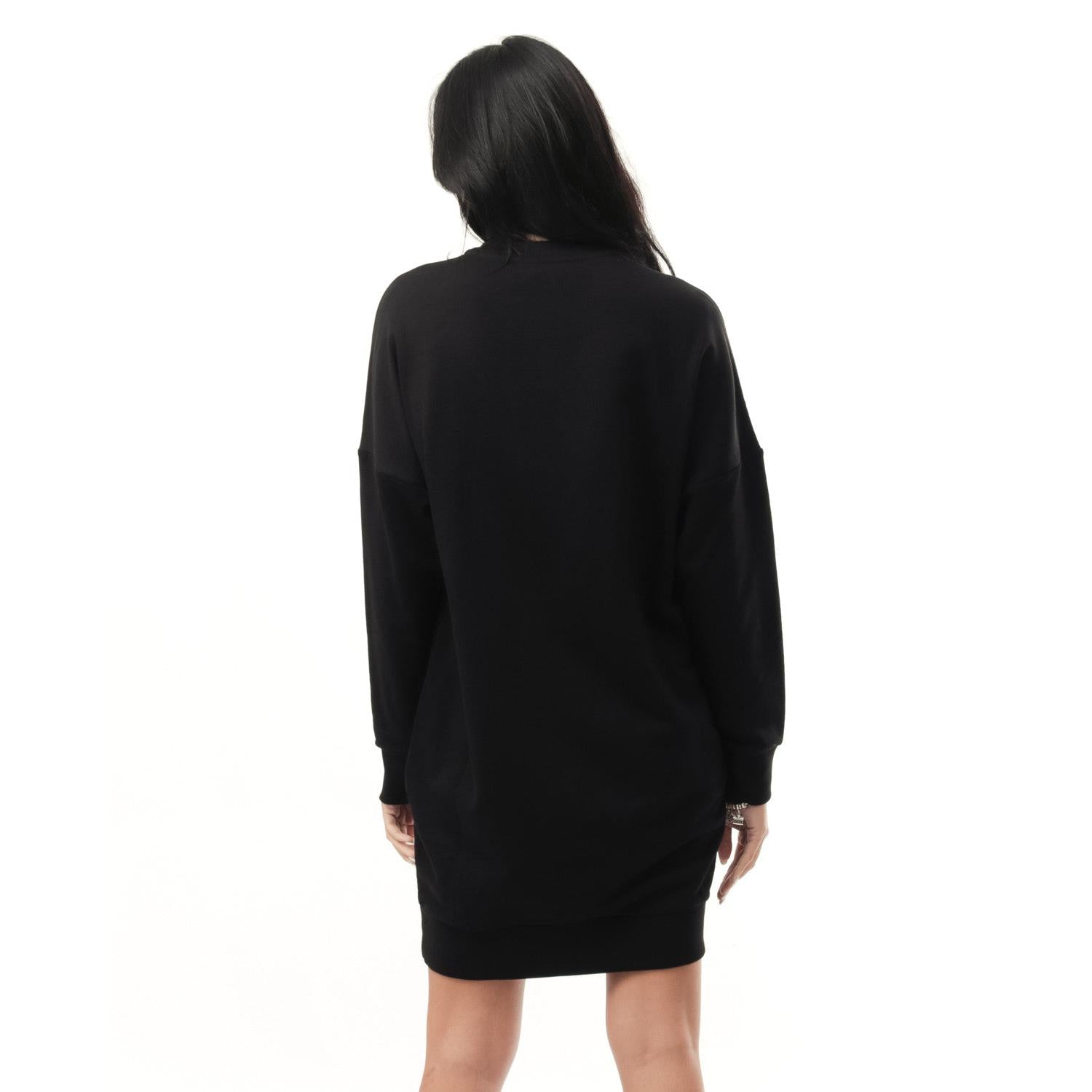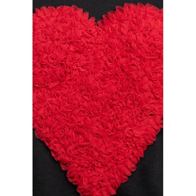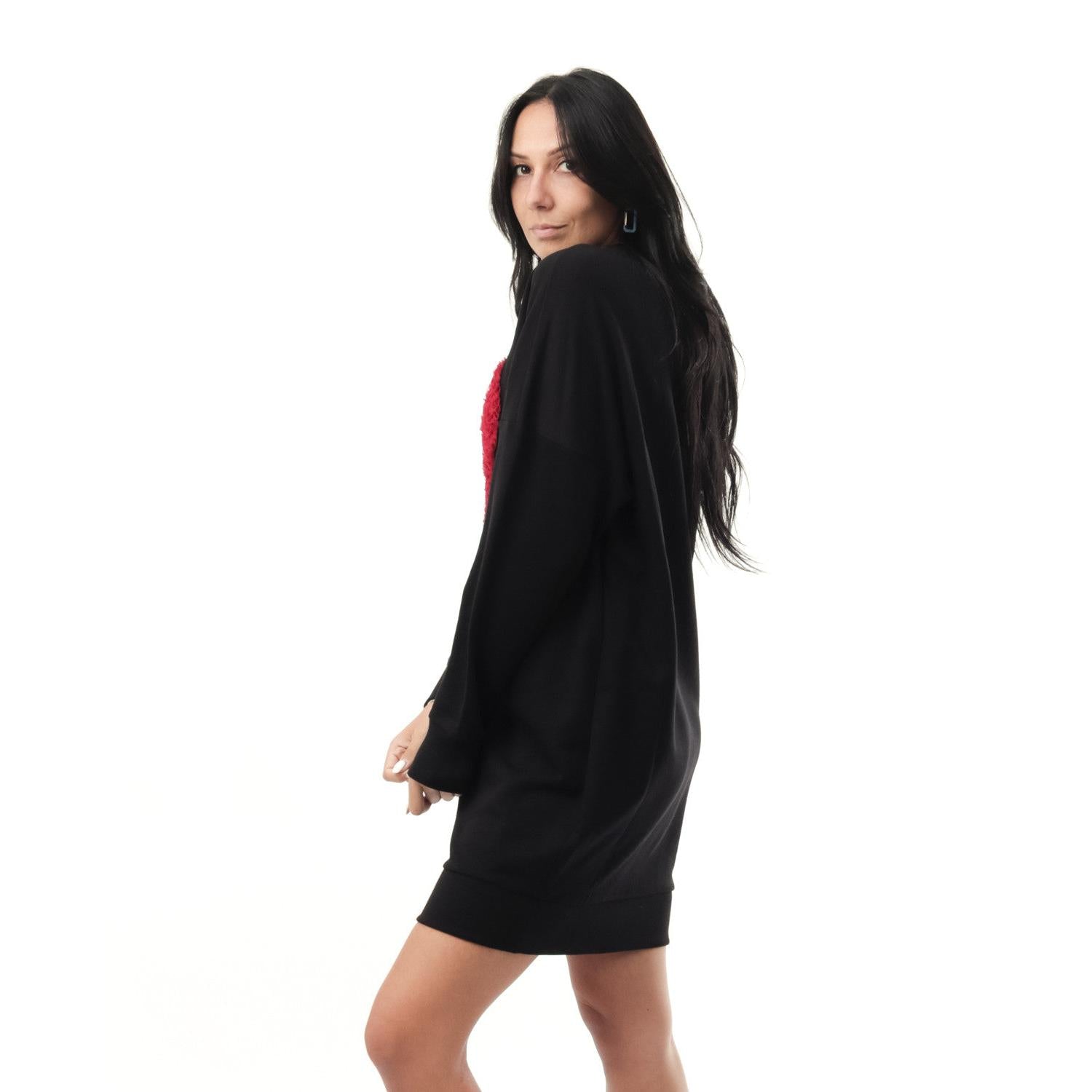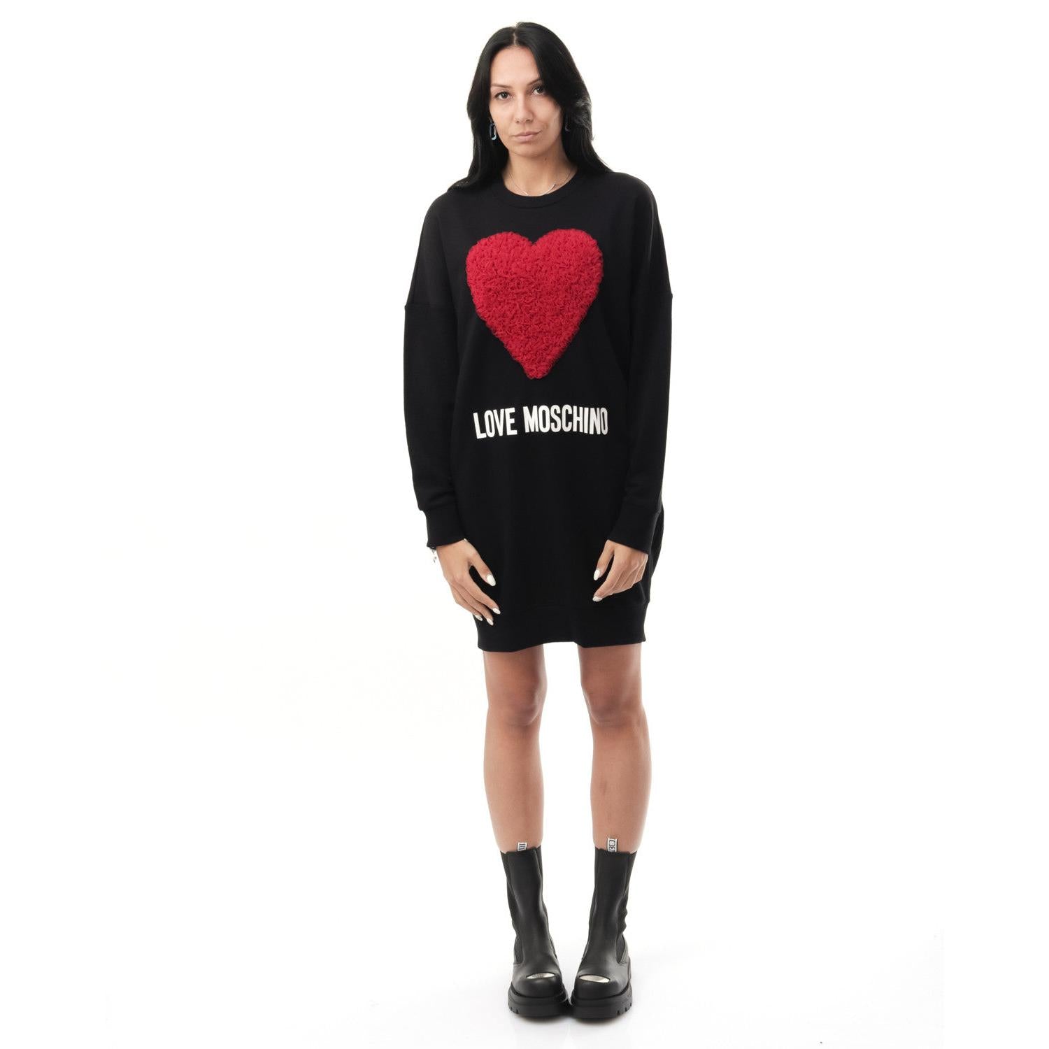 Love Moschino short black dress in brushed over-fit sweatshirt, long-sleeved crew-neck with rouches macro heart and rubberized logo