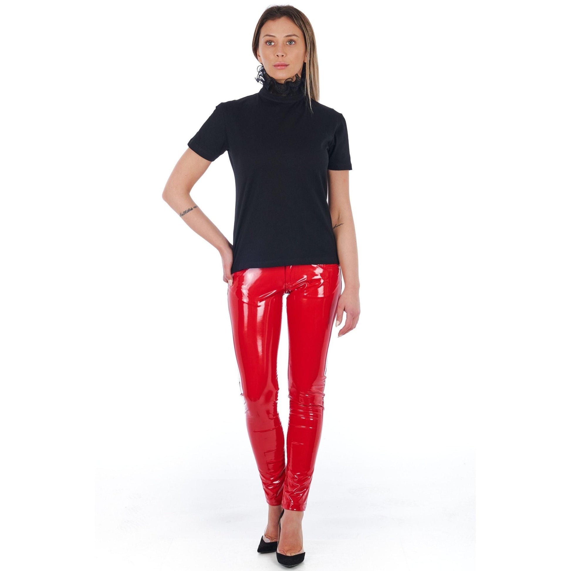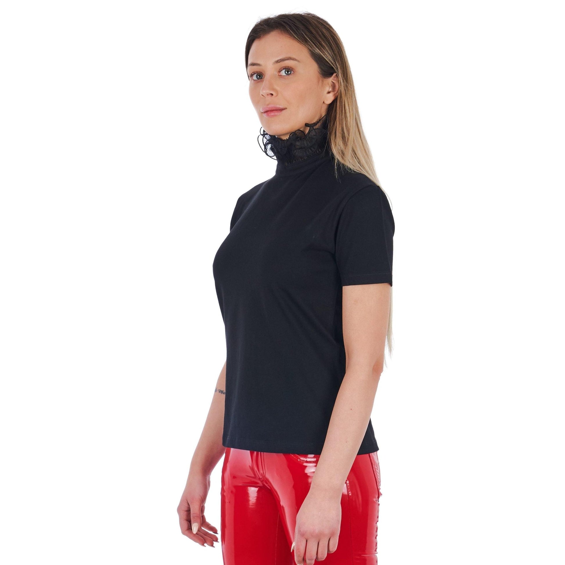 High Neck Short Sleeve T-shirt With Lace. Back With Print. Back Closure With Teardrop Opening.